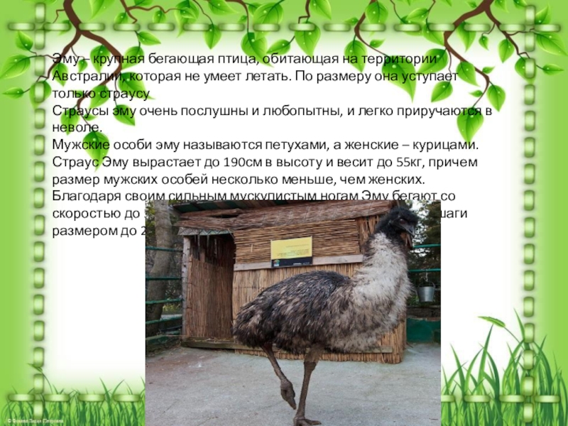 Слайд 16Эму – крупная бегающая птица, обитающая на территории Австралии, которая не