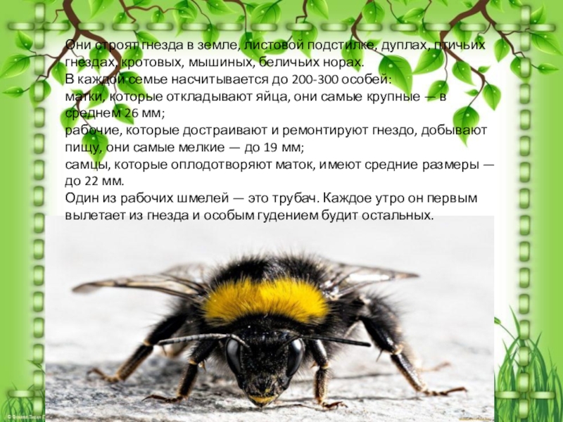 Один из рабочих шмелей — это трубач. Каждое утро он первым вылетает из гнезда и особым гудением будит остальных.