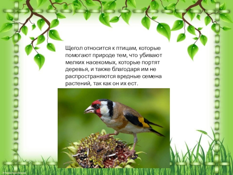 Слайд 14Щегол относится к птицам, которые помогают природе тем, что убивают мелких