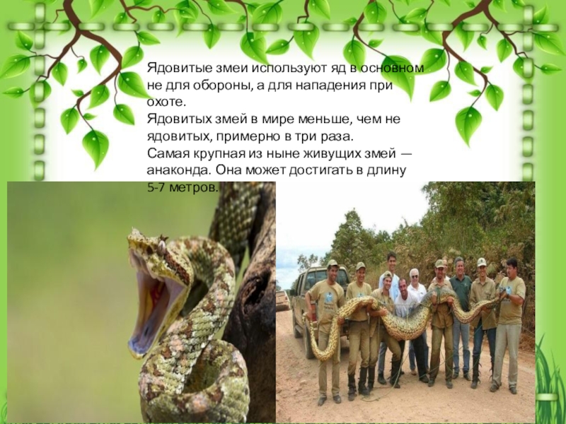 Самая крупная из ныне живущих змей — анаконда. Она может достигать в длину 5-7 метров.