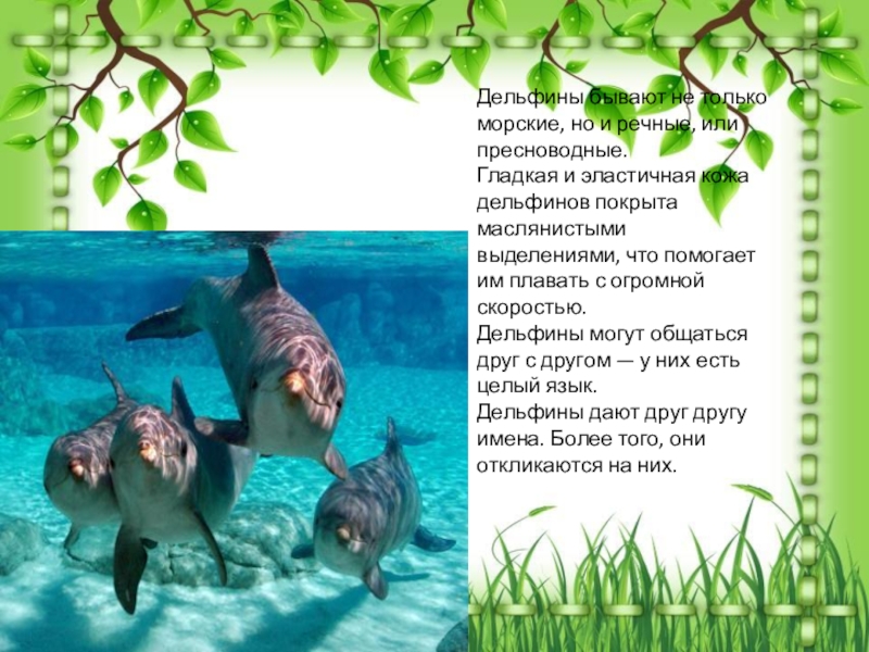 эластичная кожа дельфинов покрыта маслянистыми выделениями, что помогает им плавать с огромной скоростью.