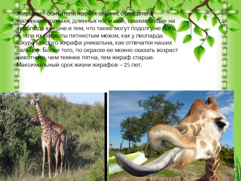 Шкура каждого жирафа уникальна, как отпечатки наших пальцев. Более того, по окраске ее можно сказать возраст животного: чем темнее пятна, тем жираф старше. Максимальный срок жизни жирафов – 25 лет.