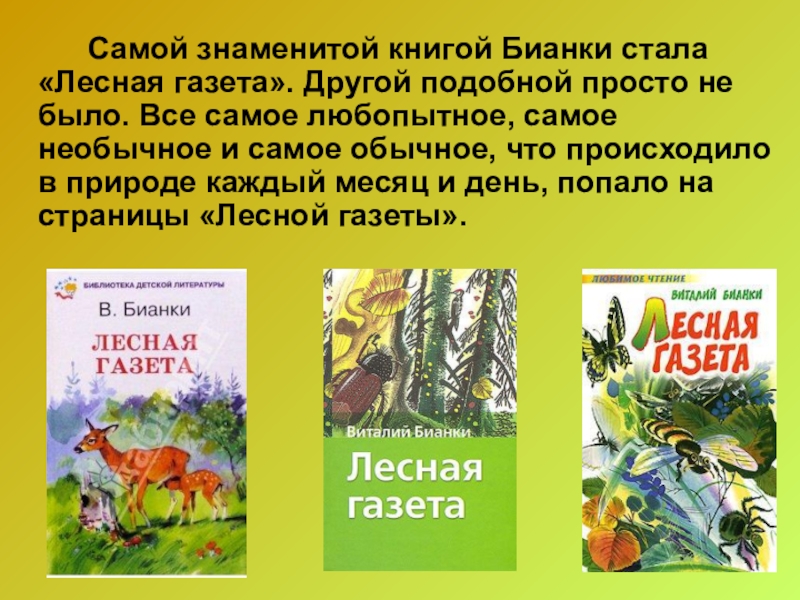 Слайд 14 Самой знаменитой книгой Бианки стала «Лесная газета». Другой подобной просто не