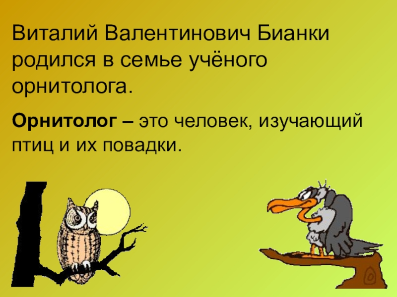Виталий Валентинович Бианки родился в семье учёного орнитолога.Орнитолог – это человек, изучающий птиц и их повадки.