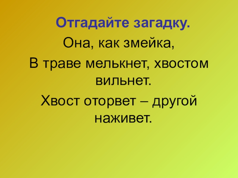 Отгадайте загадку.Она, как змейка,В траве мелькнет, хвостом вильнет.Хвост оторвет – другой наживет.