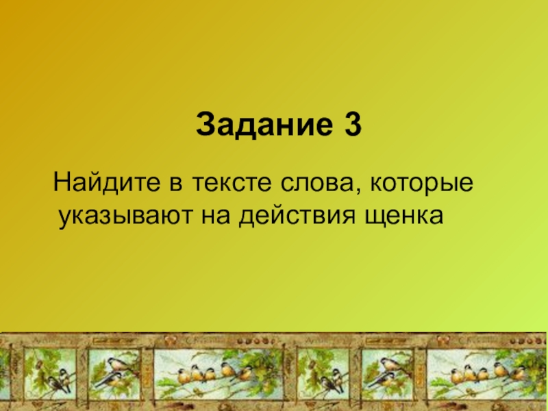 Задание 3 Найдите в тексте слова, которые указывают на действия щенка