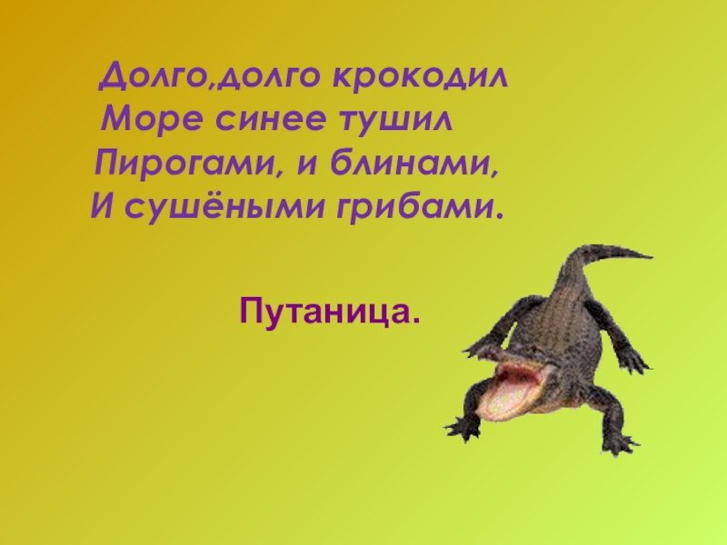 Долго,долго крокодилМоре синее тушил  Пирогами, и блинами,  И сушёными грибами.Путаница.
