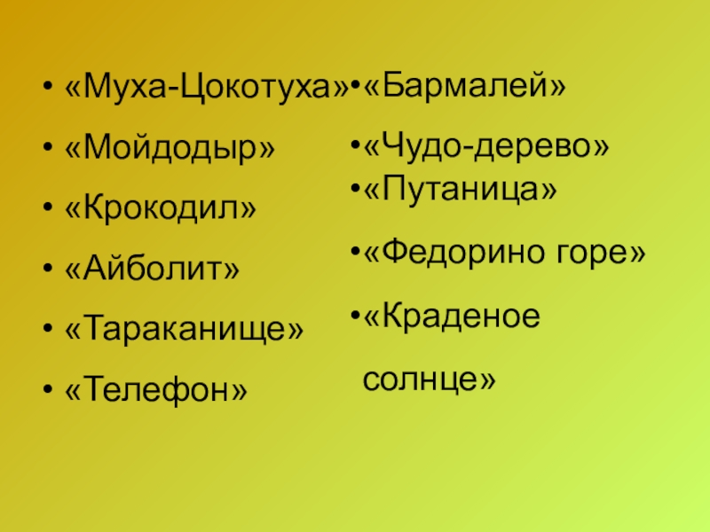 «Муха-Цокотуха»«Мойдодыр»«Крокодил»«Айболит»«Тараканище»«Телефон»«Бармалей»«Чудо-дерево»«Путаница»«Федорино горе» «Краденое солнце»