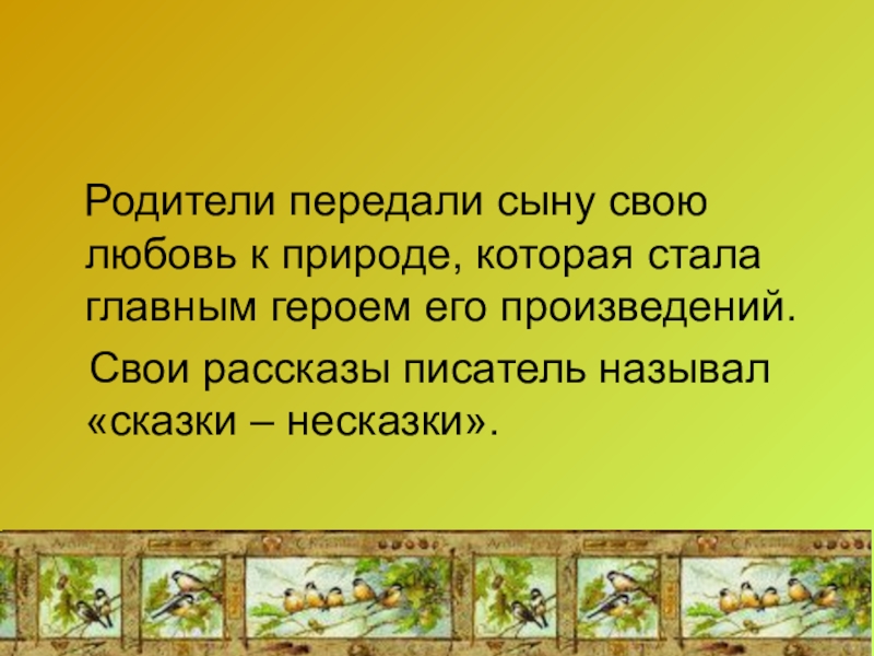 Родители передали сыну свою любовь к природе, которая стала главным героем его произведений.  Свои