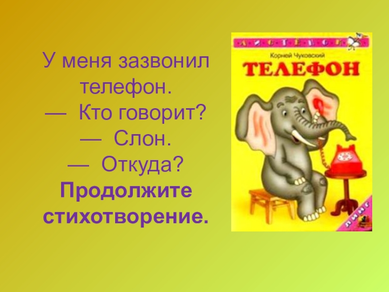 У меня зазвонил телефон. —  Кто говорит? —  Слон. —  Откуда? Продолжите стихотворение.