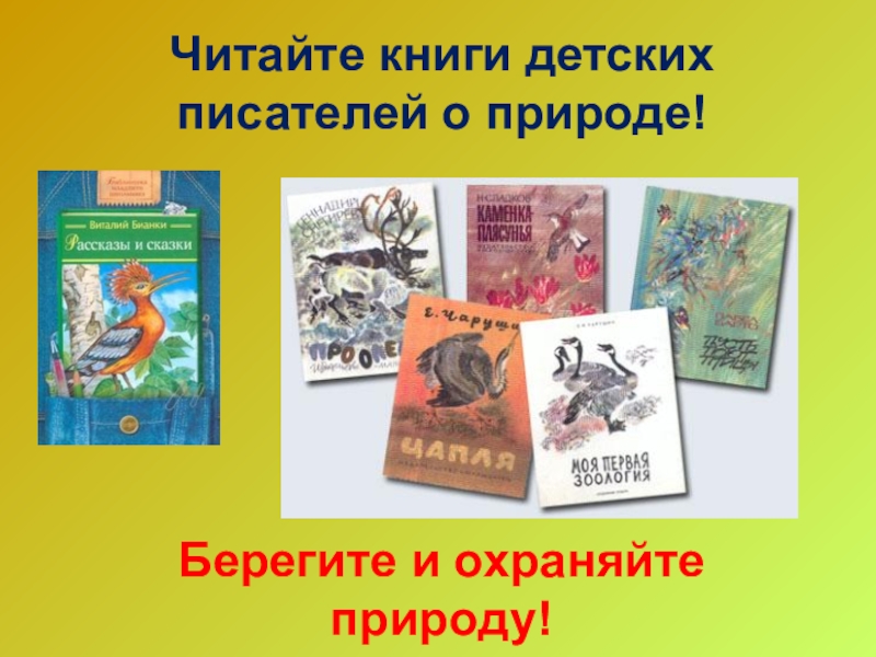 Читайте книги детских писателей о природе!Берегите и охраняйте природу!
