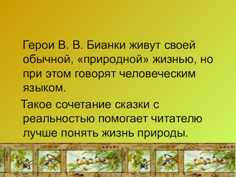 Герои В. В. Бианки живут своей обычной, «природной» жизнью, но при этом говорят человеческим языком.