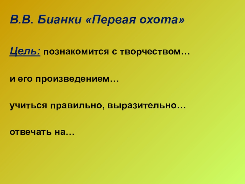В.В. Бианки «Первая охота»Цель: познакомится с творчеством…и его произведением…учиться правильно, выразительно…отвечать на…