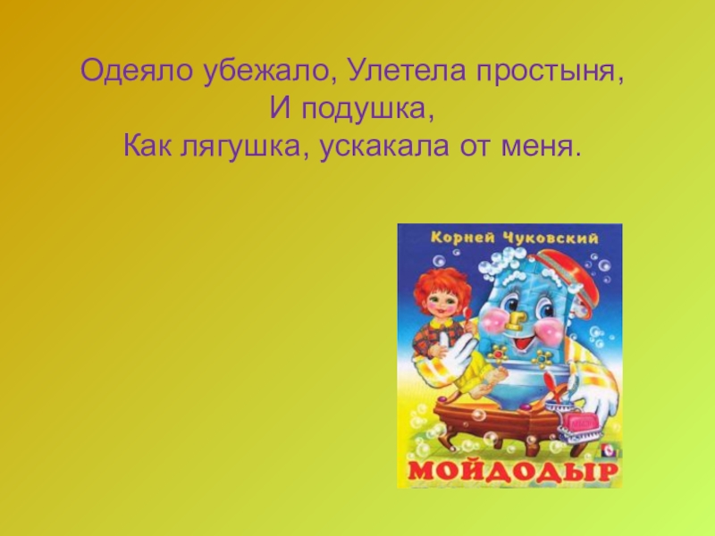 Слайд 3 Одеяло убежало, Улетела простыня, И подушка, Как лягушка, ускакала от меня.