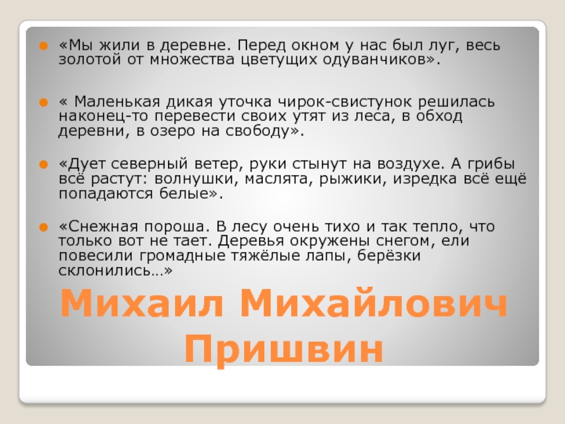 Михайлович много путешествовал. Писать он начал в 30 лет. Пришвин написал много книг о природе, и каждая из них несёт новые открытия. Вся жизнь писателя была посвящена природе и связана с ней. Пришвин любил родину: леса и поля, реки озёра, зверей и птиц.
