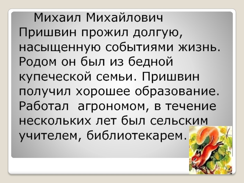 Слайд 10 Михаил Михайлович Пришвин прожил долгую, насыщенную событиями жизнь. Родом