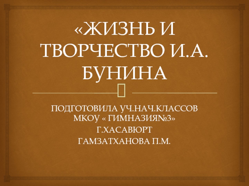 «ЖИЗНЬ И ТВОРЧЕСТВО И.А.БУНИНАПОДГОТОВИЛА УЧ.НАЧ.КЛАССОВ МКОУ « ГИМНАЗИЯ№3»Г.ХАСАВЮРТГАМЗАТХАНОВА П.М.