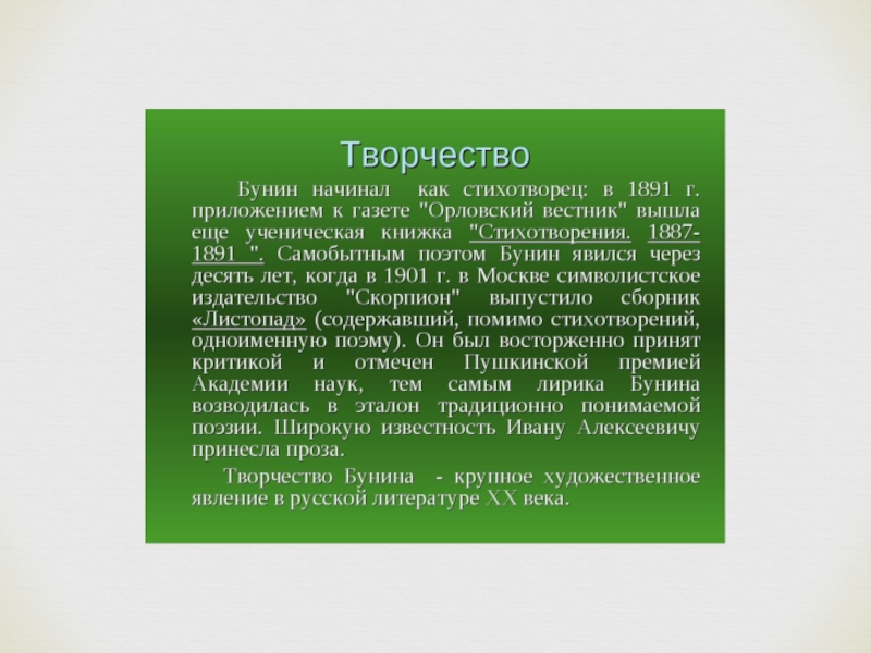 Слайд 1«ЖИЗНЬ И ТВОРЧЕСТВО И.А.БУНИНА