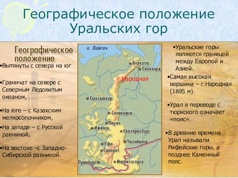 В древние времена Урал называли Рифейские горы, а позднее Каменный пояс.