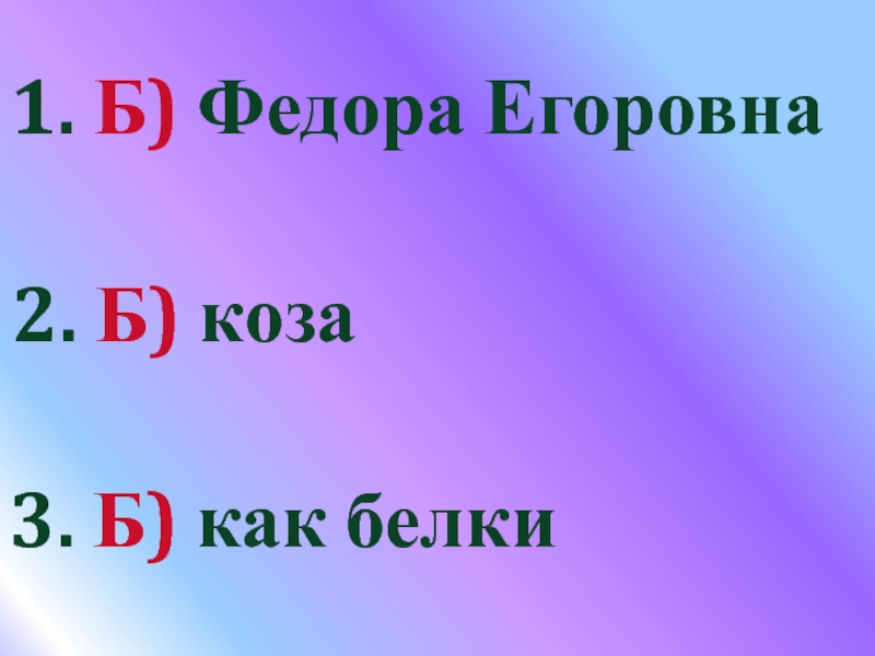 1. Б) Федора Егоровна2. Б) коза3. Б) как белки