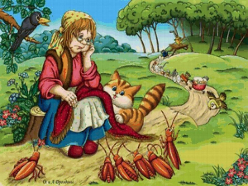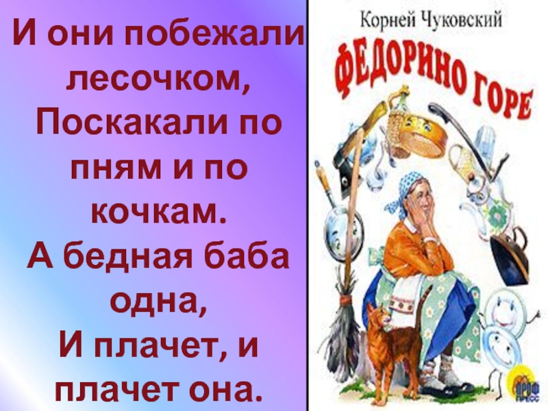 И они побежали лесочком, Поскакали по пням и по кочкам. А бедная баба одна, И плачет, и
