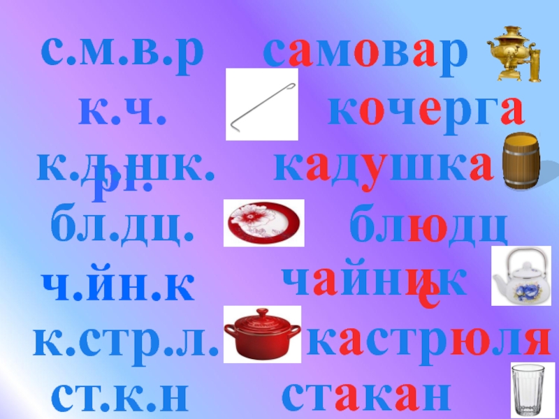 самоваркочергакадушкаблюдцечайник кастрюлястаканс.м.в.рк.ч.рг.к.д.шк.бл.дц.ч.йн.кк.стр.л.ст.к.н