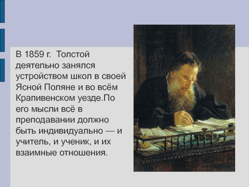 В 1859 г. Толстой деятельно занялся устройством школ в своей Ясной Поляне и во всём Крапивенском уезде.По