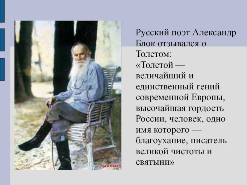 Слайд 4Русский поэт Александр Блок отзывался о Толстом: