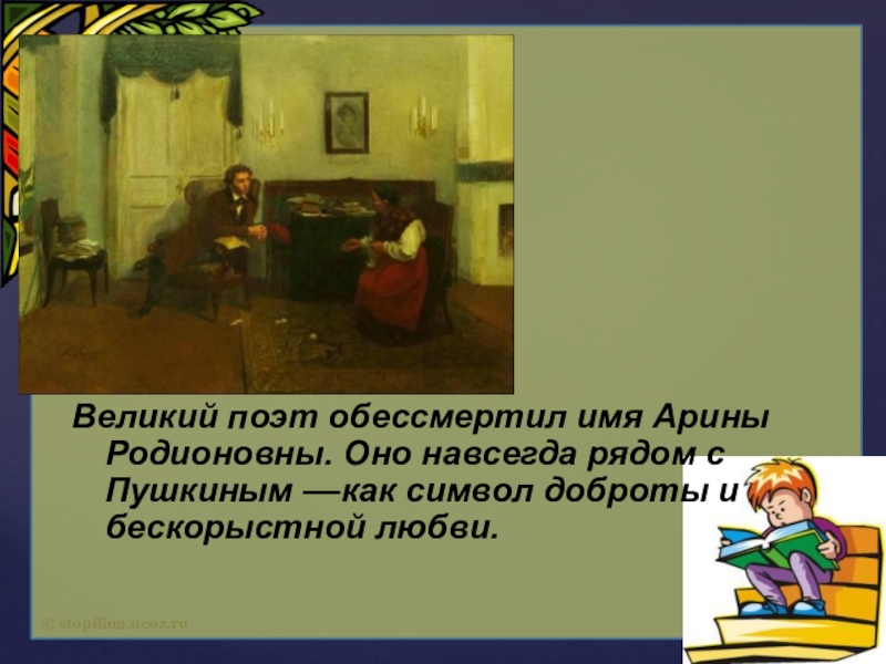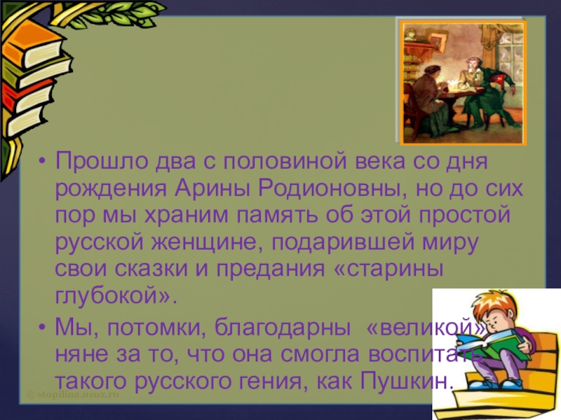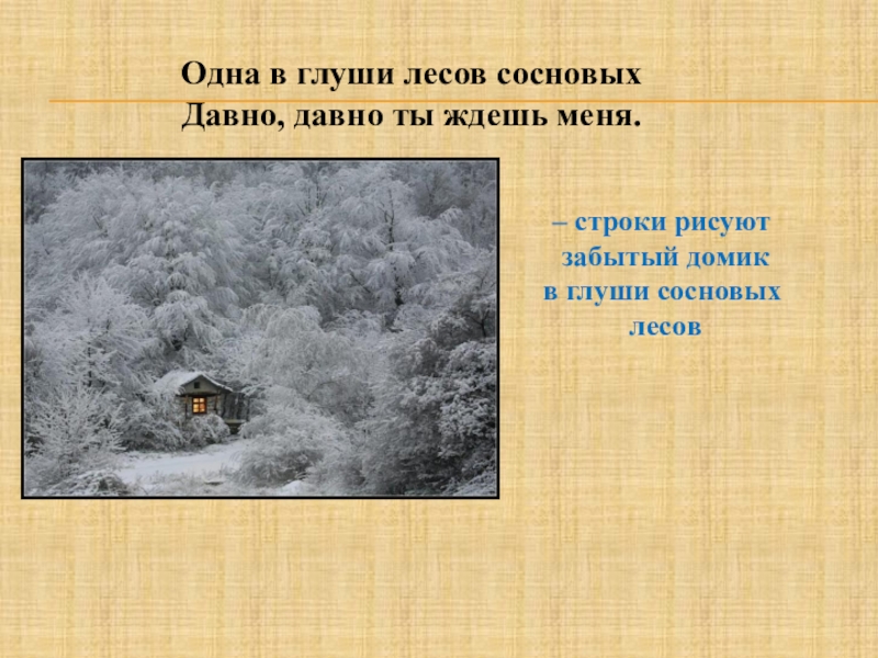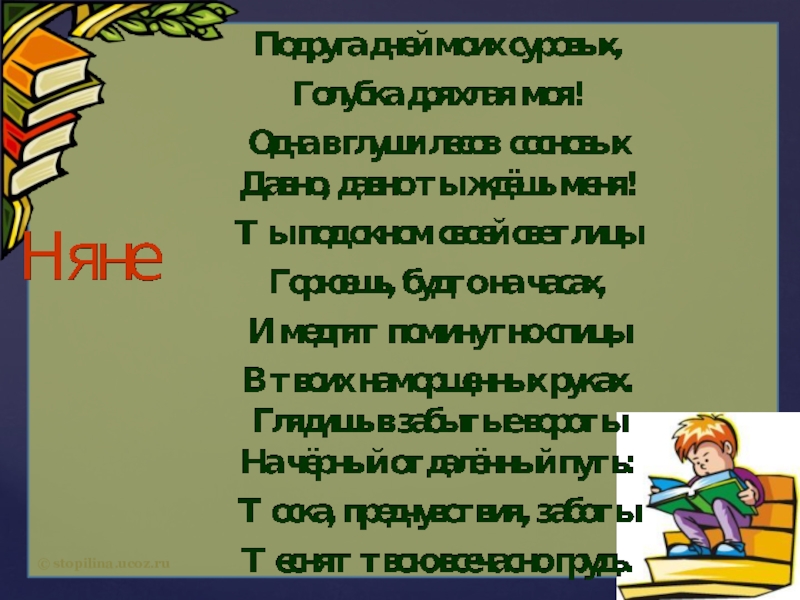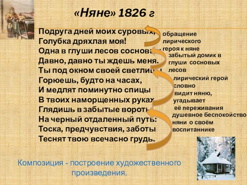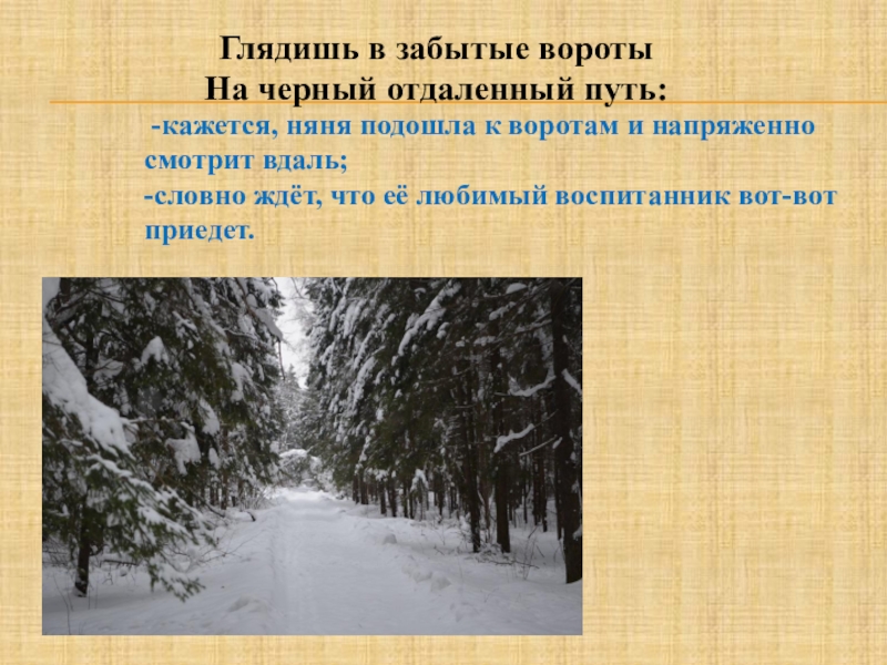 -представляется няня, сидящая у окна и поминутно вглядывающаяся вдаль.