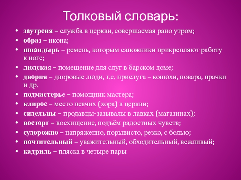 Толковый словарь:заутреня – служба в церкви, совершаемая рано утром;образ – икона;шпандырь – ремень, которым сапожники прикрепляют работу