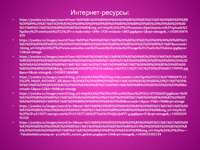 Интернет-ресурсы:https://yandex.ru/images/search?text=%D0%BC%D0%B0%D0%BA%D0%BE%D0%B2%D1%81%D0%BA%D0%B8%D0%B9%20%D1%81%D0%B2%D0%B8%D0%B4%D0%B0%D0%BD%D0%B8%D0%B5%20%D0%BA%D0%B0%D1%80%D1%82%D0%B8%D0%BD%D0%B0&img_url=http%3A%2F%2Fmuseum.clipartmania.ru%2Fuploads%2Fgallery%2Fcomthumb%2F22%2Fv-e-makovskiy-1846-1920-svidanie-1883.jpg&pos=2&rpt=simage&_=1450030876429https://yandex.ru/images/search?text=%D0%A7%D0%B5%D1%85%D0%BE%D0%B2%20%D0%90%D0%BD%D1%82%D0%BE%D0%BD%20%D0%9F%D0%B0%D0%B2%D0%BB%D0%BE%D0%B2%D0%B8%D1%87&noreask=1&img_url=http%3A%2F%2Fwww.uamodna.com%2Fassets%2Farticles%2Fimage%2Fs7tial5c%2Ffullsize.jpg&pos=12&rpt=simagehttps://yandex.ru/images/search?text=%D0%BF%D0%B5%D1%80%D0%BE%D0%B2%20%D1%82%D1%80%D0%BE%D0%B9%D0%BA%D0%B0%20%D0%BA%D0%B0%D1%80%D1%82%D0%B8%D0%BD%D0%B0%204%20%D0%BA%D0%BB%D0%B0%D1%81%D1%81%20%D1%81%D0%BE%D1%87%D0%B8%D0%BD%D0%B5%D0%BD%D0%B8%D0%B5&img_url=http%3A%2F%2Fs010.radikal.ru%2Fi311%2F1101%2F20%2F06b857199999.jpg&pos=0&rpt=simage&_=1450031066080https://yandex.ru/images/search?img_url=http%3A%2F%2Fimg-fotki.yandex.ru%2Fget%2F6521%2F78082870.165%2F0_94b69_49234047_XXL&text=%D0%B2%D0%B0%D0%BD%D1%8C%D0%BA%D0%B0%20%D1%87%D0%B5%D1%85%D0%BE%D0%B2%20%D0%BA%D0%B0%D1%80%D1%82%D0%B8%D0%BD%D0%BA%D0%B8&noreask=1&pos=22&lr=968&rpt=simagehttps://yandex.ru/images/search?img_url=http%3A%2F%2Fbct000.net%2Fpics%2F562e18703b6d9.jpg&text=%D0%B2%D0%B0%D0%BD%D1%8C%D0%BA%D0%B0%20%D1%87%D0%B5%D1%85%D0%BE%D0%B2%20%D0%BA%D0%B0%D1%80%D1%82%D0%B8%D0%BD%D0%BA%D0%B8&noreask=1&pos=19&lr=968&rpt=simagehttps://yandex.ru/images/search?p=3&text=%D1%80%D0%BE%D0%B6%D0%B4%D0%B5%D1%81%D1%82%D0%B2%D0%BE%20%D0%BA%D0%B0%D1%80%D1%82%D0%B8%D0%BD%D0%BA%D0%B8&img_url=http%3A%2F%2Fcs319327.userapi.com%2Fv319327136%2F76cb%2F6QQvQeBYY-g.jpg&pos=91&rpt=simage&_=1450032992220https://yandex.ru/images/search?p=3&text=%D1%80%D0%BE%D0%B6%D0%B4%D0%B5%D1%81%D1%82%D0%B2%D0%BE%20%D0%BC%D0%BE%D1%81%D0%BA%D0%B2%D0%B0%2019%20%D0%B2%D0%B5%D0%BA%20%D0%BA%D0%B0%D1%80%D1%82%D0%B8%D0%BD%D0%BA%D0%B8&img_url=http%3A%2F%2Fxn----7sbab6ahkdcuvaznp.xn--p1ai%2Fs_novym_godom.png&pos=106&rpt=simage&_=1450033302154