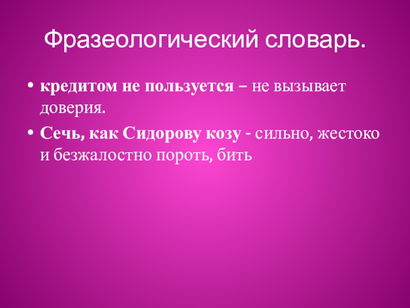 Фразеологический словарь.кредитом не пользуется – не вызывает доверия.Сечь, как Сидорову козу - сильно, жестоко и безжалостно пороть,