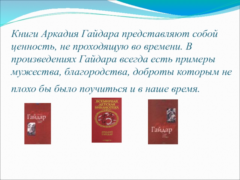 Слайд 15Книги Аркадия Гайдара представляют собой ценность, не проходящую во времени. В