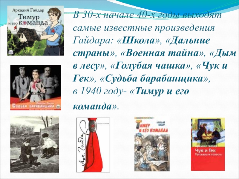 Слайд 12В 30-х начале 40-х годы выходят самые известные произведения Гайдара: «Школа»,