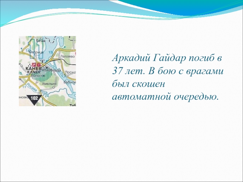 Слайд 14Аркадий Гайдар погиб в 37 лет. В бою с врагами был