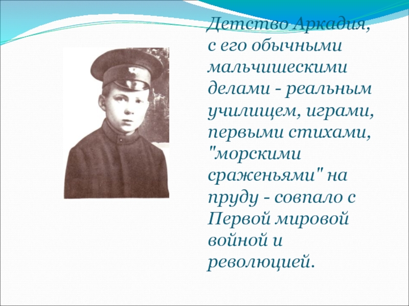 Слайд 7Детство Аркадия, с его обычными мальчишескими делами - реальным училищем, играми,
