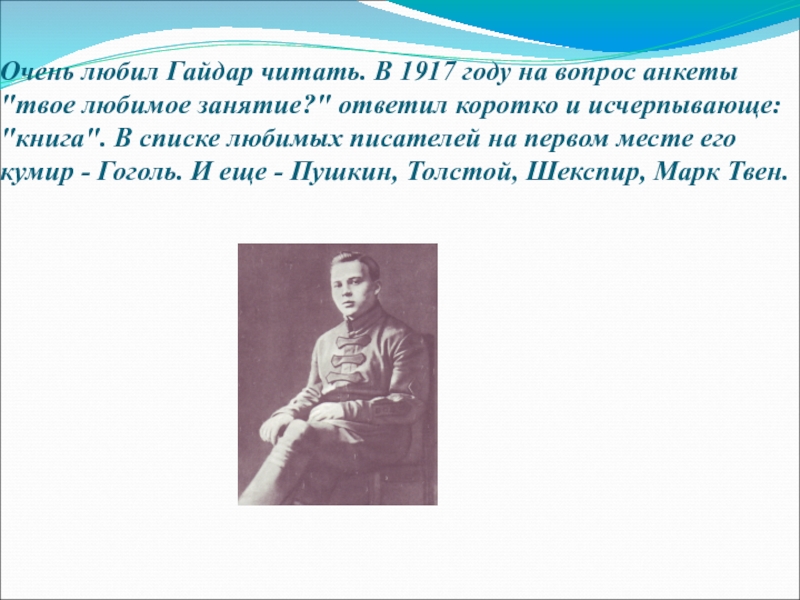 Слайд 10Очень любил Гайдар читать. В 1917 году на вопрос анкеты "твое