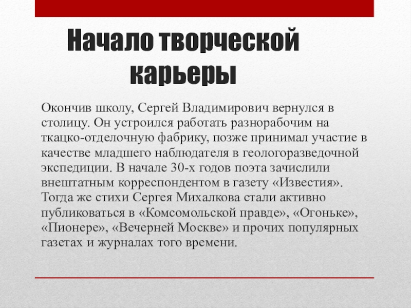 работать разнорабочим на ткацко-отделочную фабрику, позже принимал участие в качестве младшего наблюдателя в геологоразведочной экспедиции. В начале 30-х годов поэта зачислили внештатным корреспондентом в газету «Известия». Тогда же стихи Сергея Михалкова стали активно публиковаться в «Комсомольской правде», «Огоньке», «Пионере», «Вечерней Москве» и прочих популярных газетах и журналах того времени.