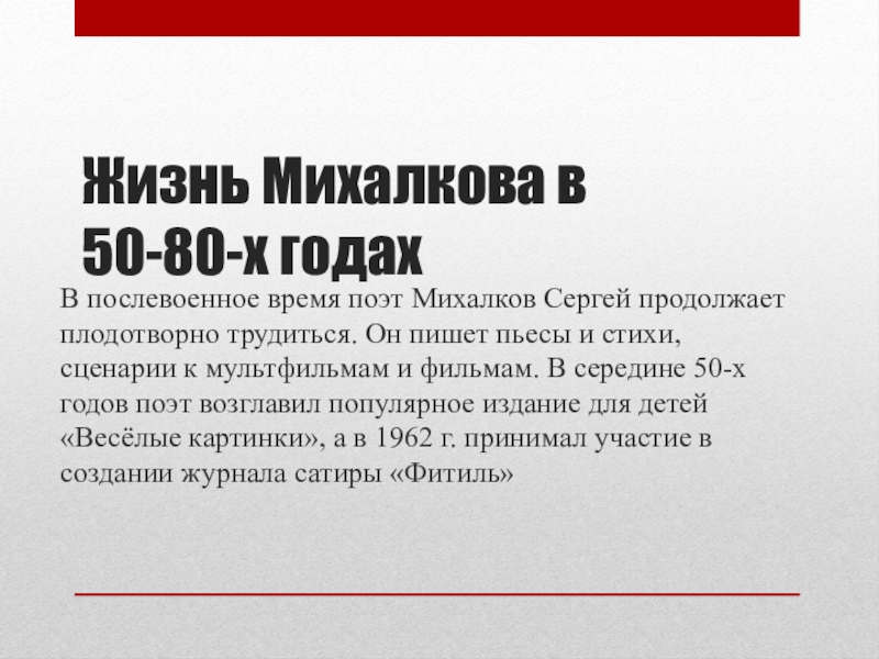Михалков Сергей продолжает плодотворно трудиться. Он пишет пьесы и стихи, сценарии к мультфильмам и фильмам. В середине 50-х годов поэт возглавил популярное издание для детей «Весёлые картинки», а в 1962 г. принимал участие в создании журнала сатиры «Фитиль»
