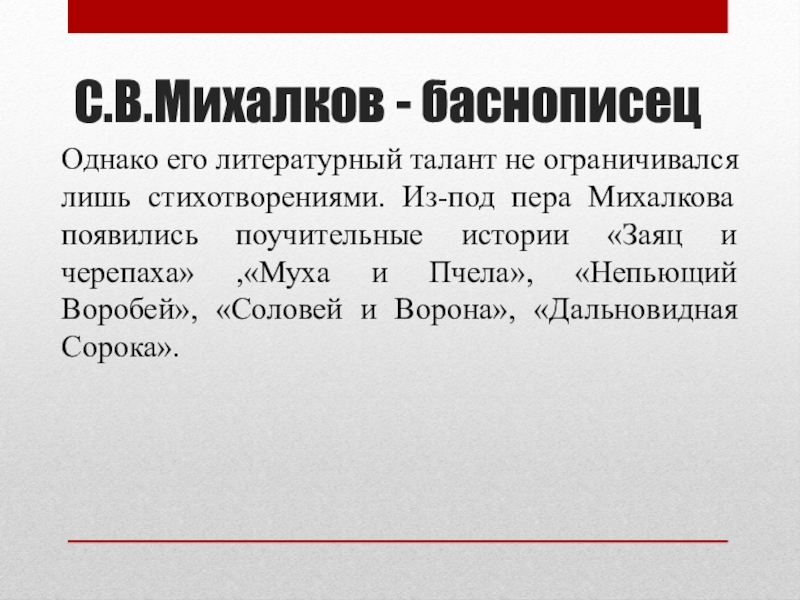 пера Михалкова появились поучительные истории «Заяц и черепаха» ,«Муха и Пчела», «Непьющий Воробей», «Соловей и Ворона», «Дальновидная Сорока».
