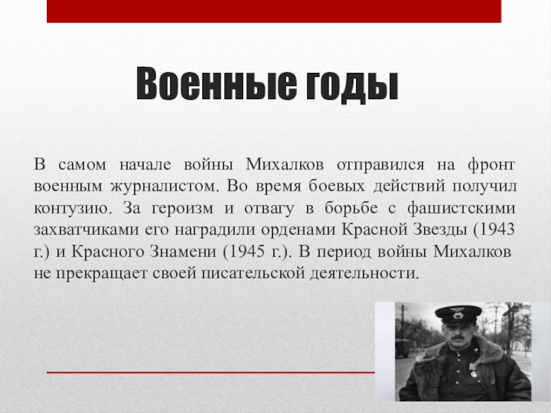 Во время боевых действий получил контузию. За героизм и отвагу в борьбе с фашистскими захватчиками его наградили орденами Красной Звезды (1943 г.) и Красного Знамени (1945 г.). В период войны Михалков не прекращает своей писательской деятельности.