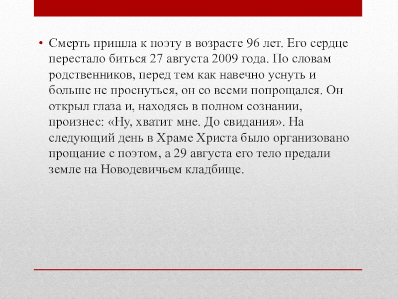 Слайд 26Смерть пришла к поэту в возрасте 96 лет. Его сердце перестало