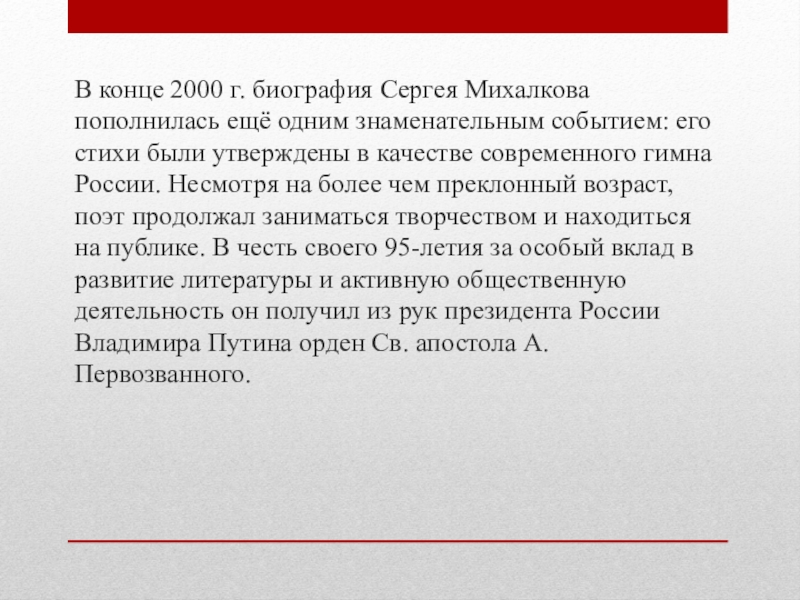Слайд 24В конце 2000 г. биография Сергея Михалкова пополнилась ещё одним знаменательным