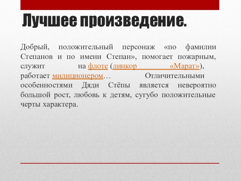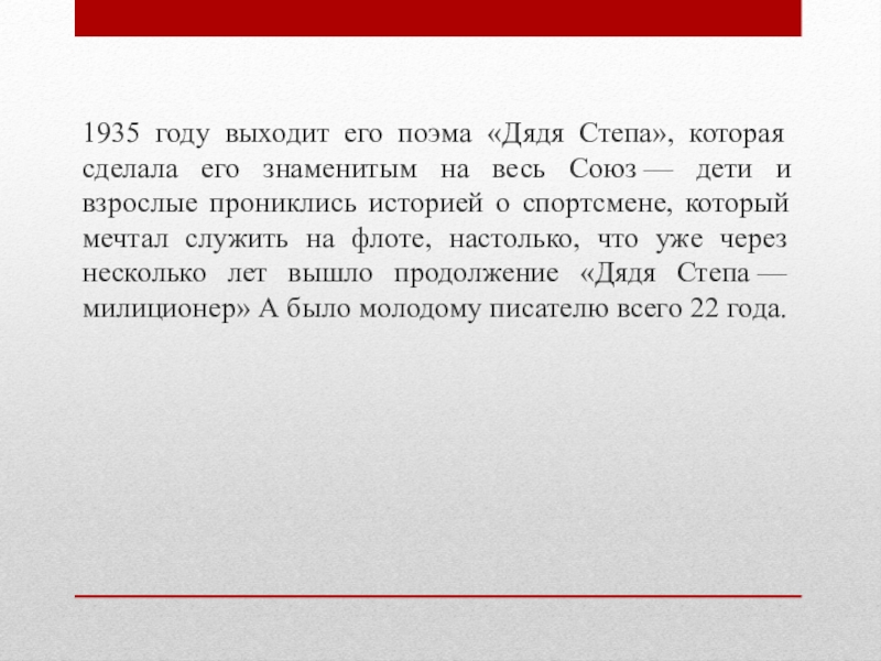 Слайд 131935 году выходит его поэма «Дядя Степа», которая сделала его знаменитым