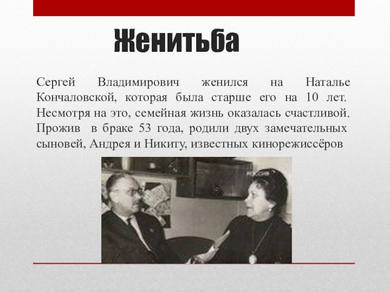 10 лет. Несмотря на это, семейная жизнь оказалась счастливой. Прожив в браке 53 года, родили двух замечательных сыновей, Андрея и Никиту, известных кинорежиссёров
