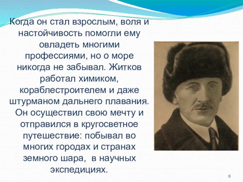 профессиями, но о море никогда не забывал. Житков работал химиком, кораблестроителем и даже штурманом дальнего плавания. Он осуществил свою мечту и отправился в кругосветное путешествие: побывал во многих городах и странах земного шара, в научных экспедициях.