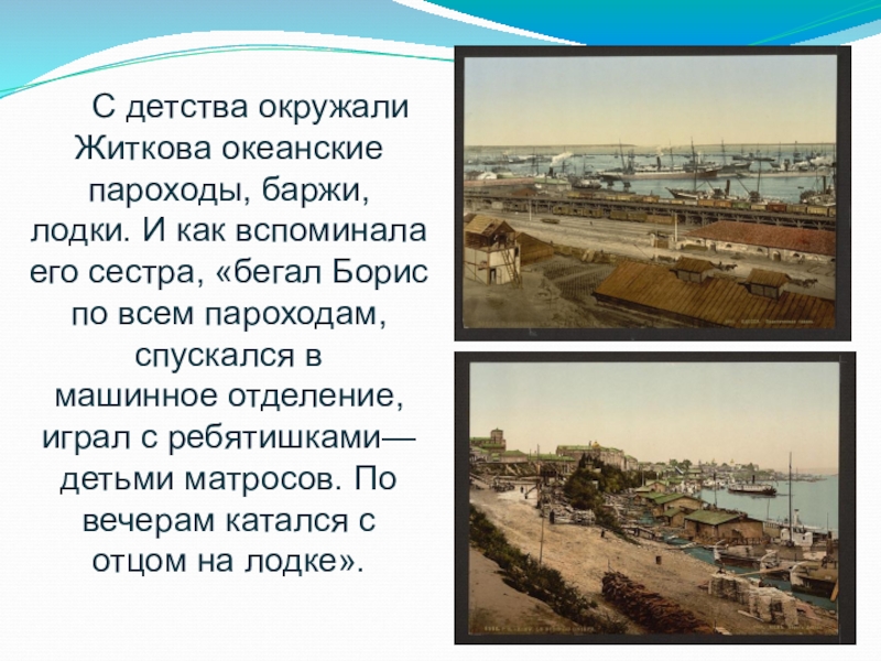Слайд 4С детства окружали Житкова океанские пароходы, баржи, лодки. И как вспоминала его сестра,