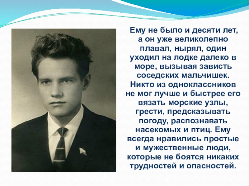 великолепно плавал, нырял, один уходил на лодке далеко в море, вызывая зависть соседских мальчишек. Никто из одноклассников не мог лучше и быстрее его вязать морские узлы, грести, предсказывать погоду, распознавать насекомых и птиц. Ему всегда нравились простые и мужественные люди, которые не боятся никаких трудностей и опасностей.