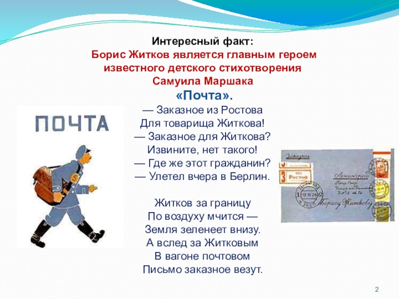 Борис Житков является главным героем известного детского стихотворения Самуила Маршака