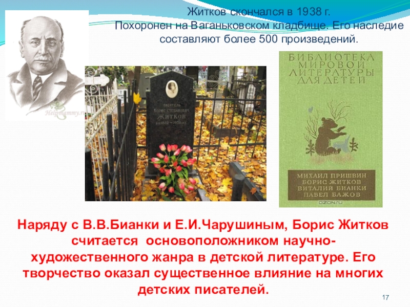 Наряду с В.В.Бианки и Е.И.Чарушиным, Борис Житков считается основоположником научно-художественного жанра